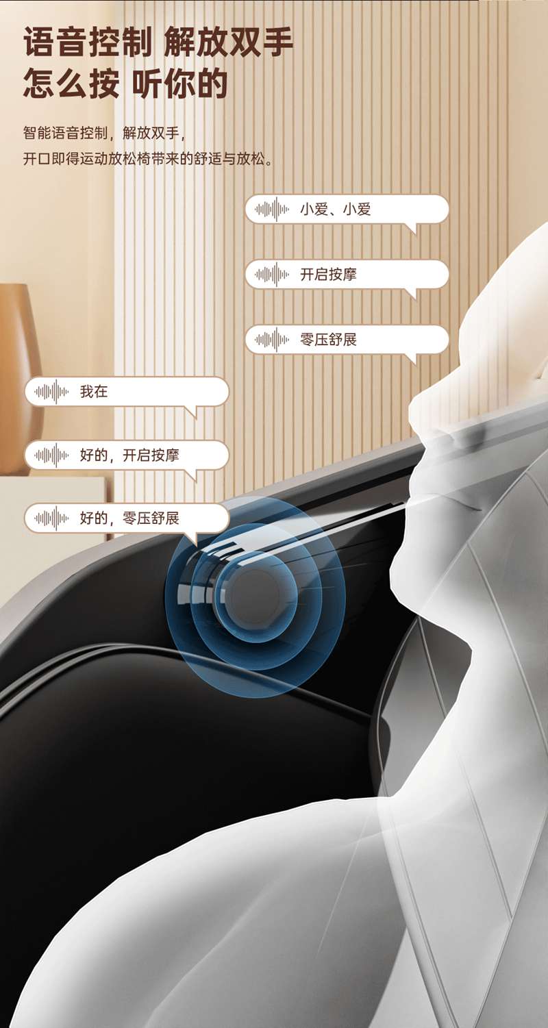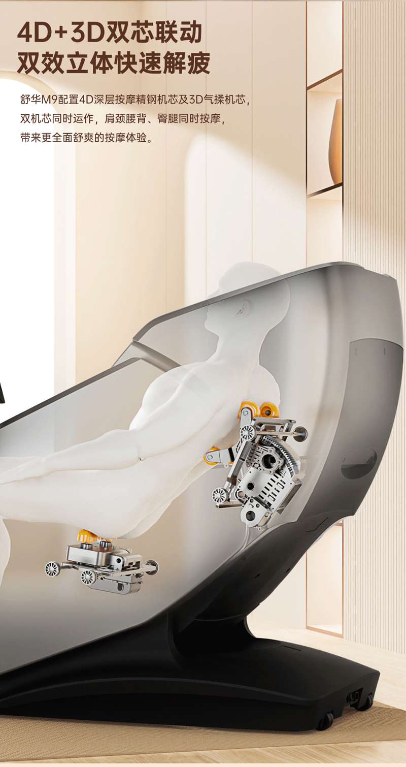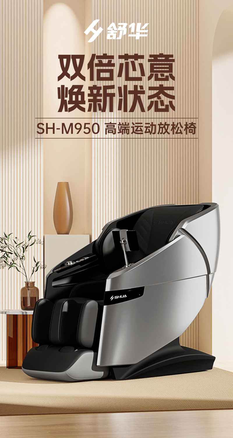 SH-M950 高端运动放松椅四大独家特色运动放松程序Y轻松搞定各种疲劳,20+按摩放松模式,提供多样化的按摩模式和力度调节,满足不同场景下的放松需求,4D深层按摩精钢机芯及3D气揉机芯;双机芯同时运作Y肩颈腰背臀腿同时按摩Y带来更全面舒爽的按摩体验,5档精控力度,前伸深度可达10.5cm触达深层筋膜Y松筋开背Y直击酸痛。