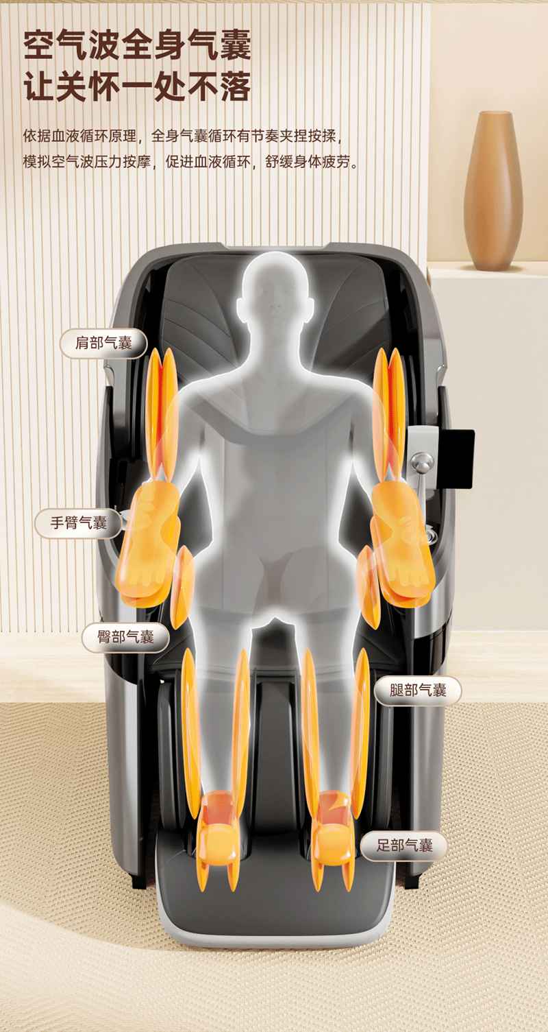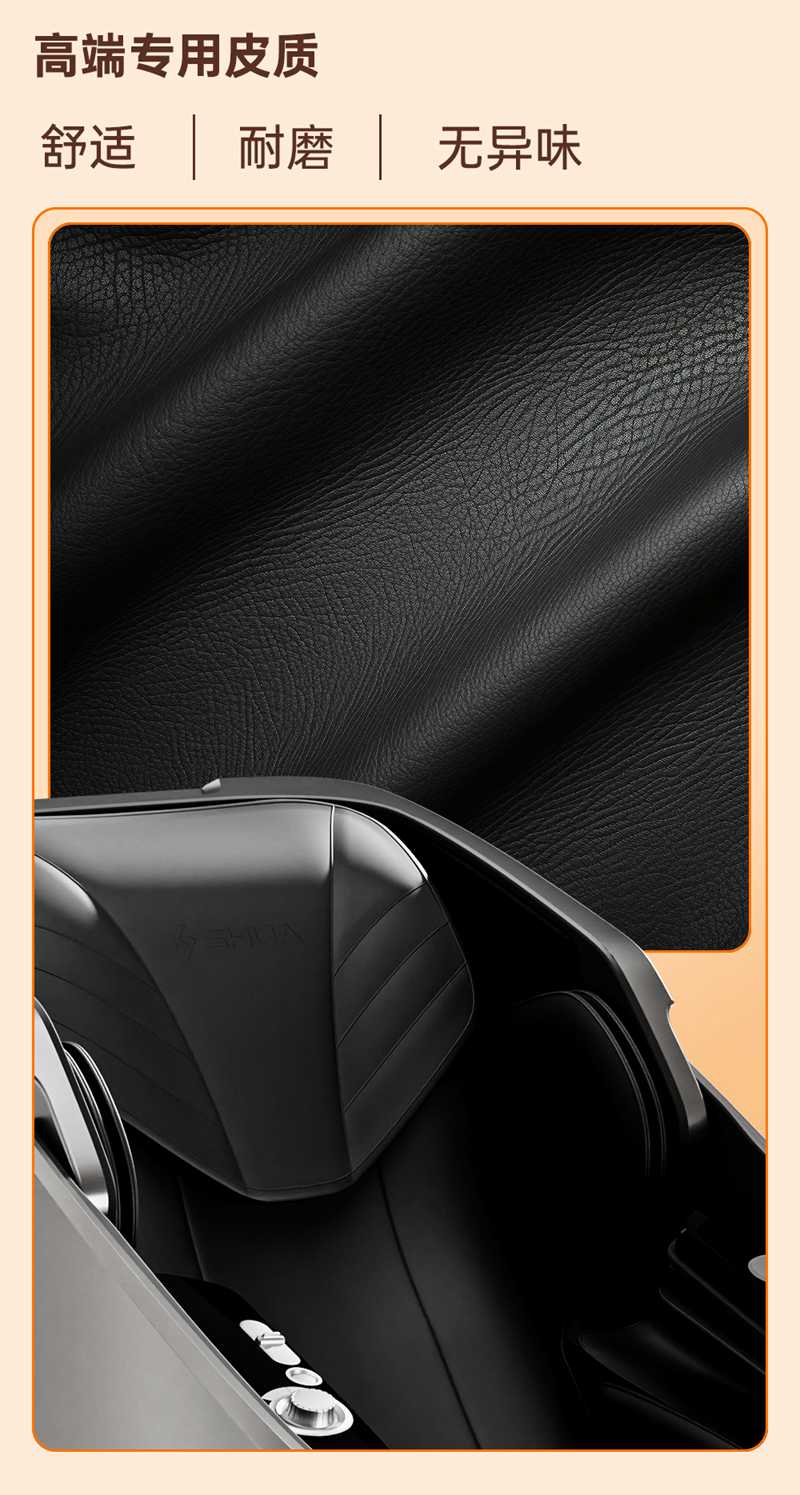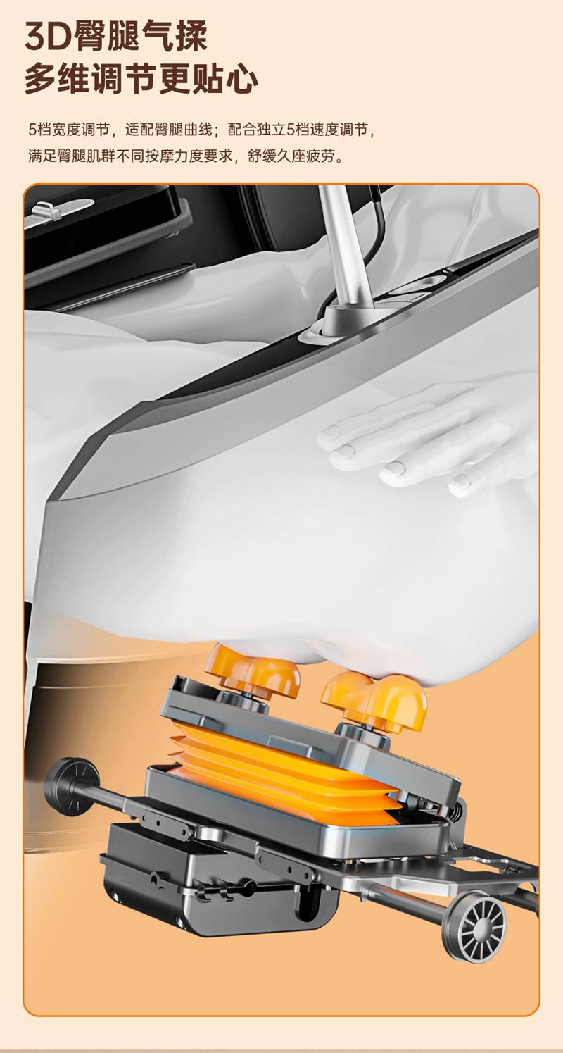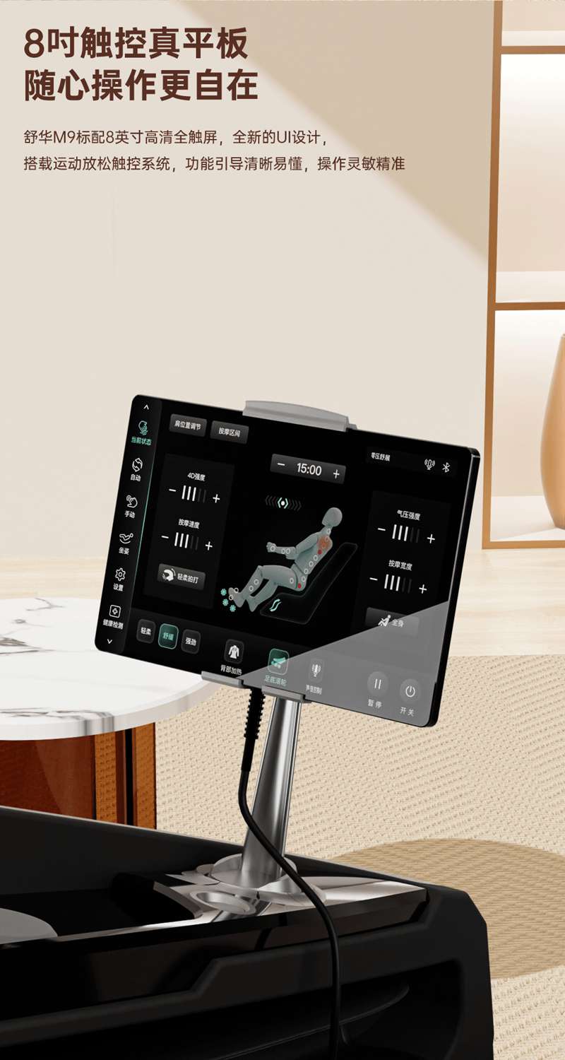 SH-M950 高端运动放松椅四大独家特色运动放松程序Y轻松搞定各种疲劳,20+按摩放松模式,提供多样化的按摩模式和力度调节,满足不同场景下的放松需求,4D深层按摩精钢机芯及3D气揉机芯;双机芯同时运作Y肩颈腰背臀腿同时按摩Y带来更全面舒爽的按摩体验,5档精控力度,前伸深度可达10.5cm触达深层筋膜Y松筋开背Y直击酸痛。