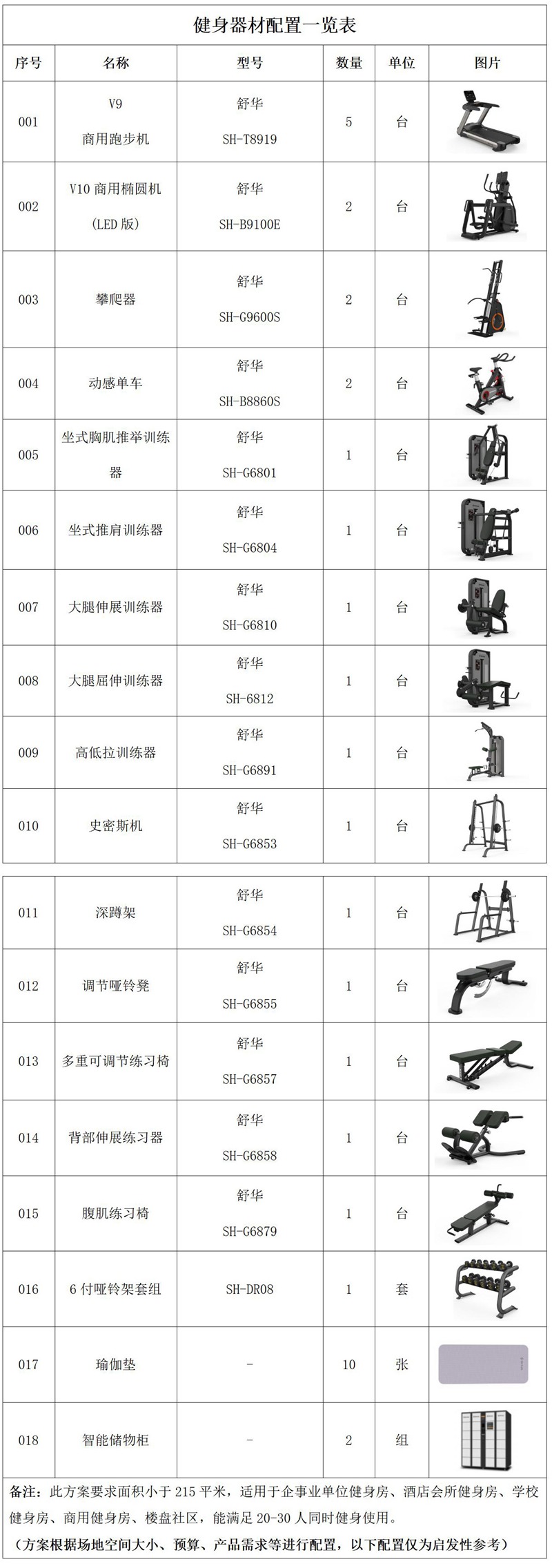 此方案要求面积小于215平米,适用于企事业单位健身房、酒店会所健身房、学校健身房、商用健身房、楼盘社区,能满足20-30人同时健身使用。(方案根据场地空间大小、预算、产品需求等进行配置,以下配置仅为启发性参考)