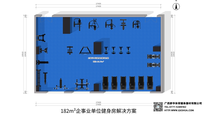 此方案要求面积小于182m²,适用于企事业单位、酒店会所、楼盘社区、学校、商用健身等健身场所,能满足20-30人同时健身使用。(方案根据场地空间大小、预算、产品需求等进行配置仅为启发性参考)