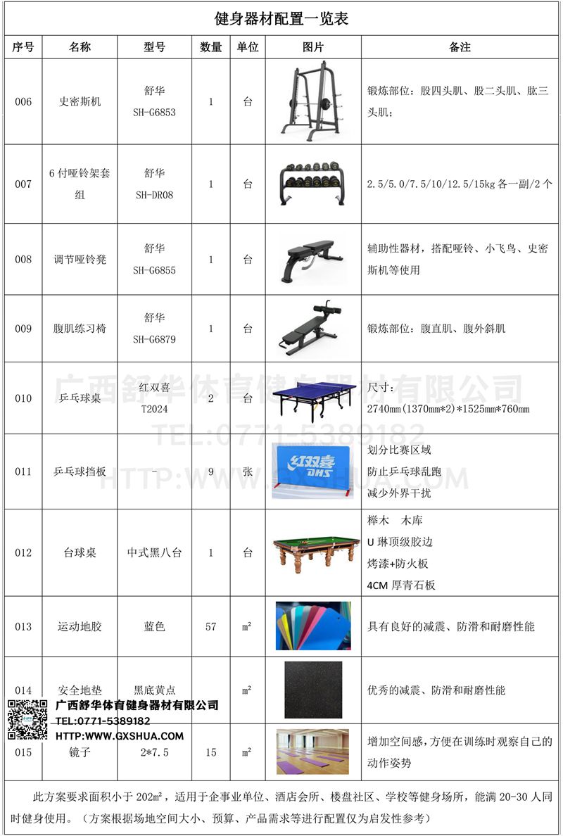 此方案要求面积小于202m²,适用于企事业单位、酒店会所、楼盘社区、学校等健身场所,能满20-30人同时健身使用。(方案根据场地空间大小、预算、产品需求等进行配置仅为启发性参考)
