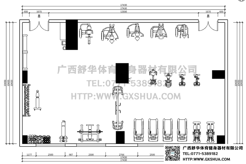 此方案要求面积小于182m²,适用于企事业单位、酒店会所、楼盘社区、工作室、学校等健身场所,能满20-30人同时健身使用。(方案根据场地空间大小、预算、产品需求等进行配置仅为启发性参考)