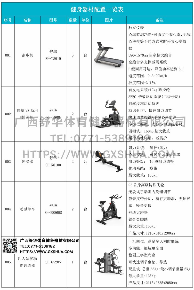 1.熊猫体育V9跑步机SH-T8919*5台-580*1570mm超宽超大跑台-跑感舒适,跑台整体安全稳定;全跑台多支撑减震平台,保证跑台超强支撑力,达到180kg支撑,满足专业健身房需求。F级商用马达-超强马达,AC 3.0HP 交流,峰值功率达到6HP,F级商用品质。速度范围达到0.8-20km/h;V9跑步机可实现跑台扬升功能,坡度范围-3~15%,满足客户不同的锻炼需求。