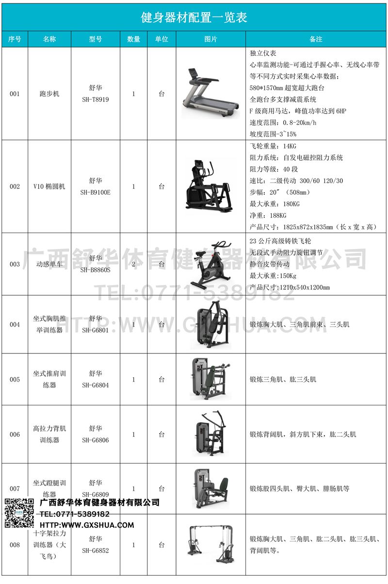 大飞鸟(1台)、史密斯机(1台)、多重可调节练习椅(1台)、腹肌训练器(1台)、罗马椅、上斜练习椅(1台)、10付哑铃套组(1套)、可调哑铃凳(1张)、私教小工具(一批)可以实现对不同肌肉群的针对性训练,满足肌肉训练需求,全方位激活身体机能。
