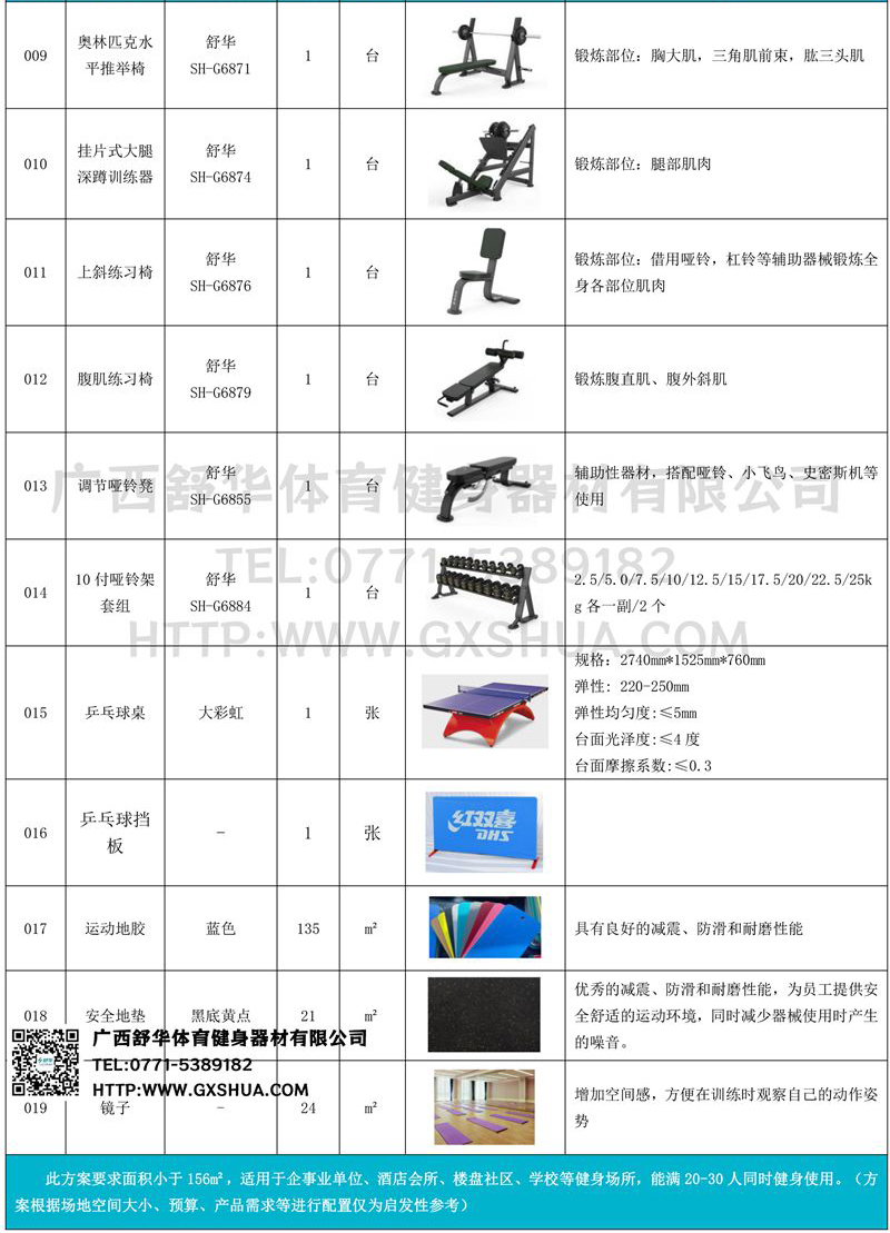 此方案要求面积小于156m²,适用于企事业单位、酒店会所、楼盘社区、学校等健身场所,能满20-30人同时健身使用。(方案根据场地空间大小、预算、产品需求等进行配置仅为启发性参考)