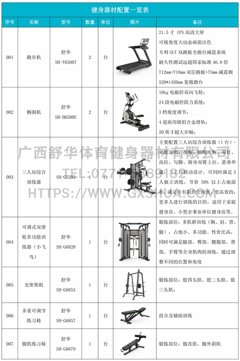 主要配置三人站综合训练器(1台)-功能说明:推胸、蝴蝶夹胸、双杠、高拉、勾脚、俯身双臂上拉、悬垂举腿;三工位联动设计,可同时满足3人独立训练,节省 50% 以上占地面积,满足在有限的空间里,更高效的, 更多人进行训练的目的,适用于家庭健身房、小型企事业单位健身房等。