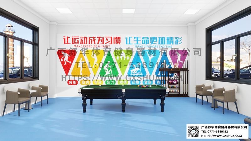 10.台球桌*1张-单位健身房配置台球桌,为员工的业余生活增添了乐趣和选择。与传统的健身器材锻炼相比,台球具有更强的娱乐性和趣味性,能够吸引更多员工参与到健身活动中来,提高健身房的使用率,让员工在工作之余有更多放松身心的方式。