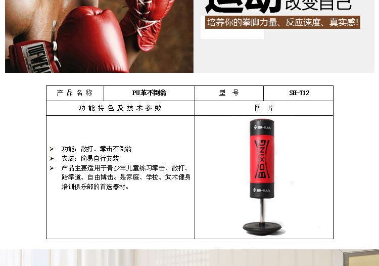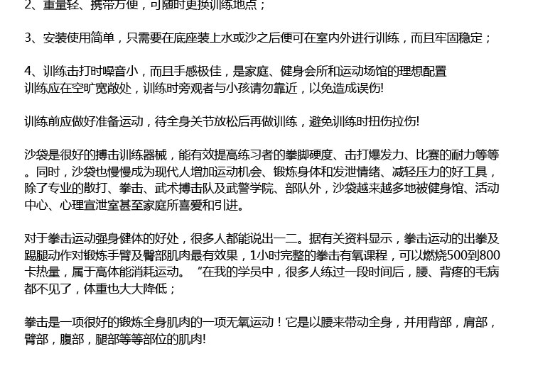 产品主要适用于练习拳击、散打、跆拳道、自由搏击。是家庭、武术健身培训俱乐部的首选器材