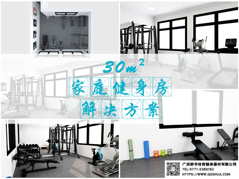 此方案要求面积小于30m²,适用于小型单位健身房、工作室、家庭健身房等健身场所,能满5-8人同时健身使用。(方案根据场地空间大小、预算、产品需求等进行配置仅为启发性参考)